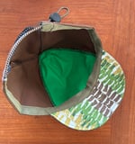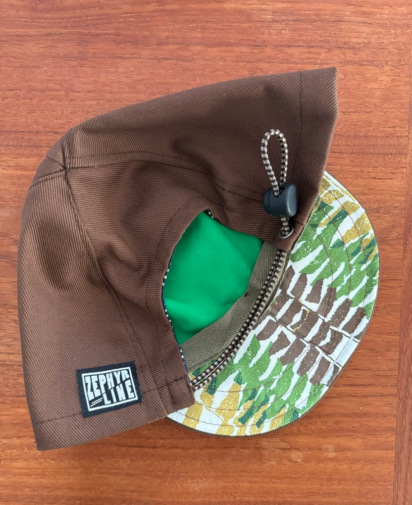 New 10 ounce brown denim twill bungee caps made by Zephyr Line Workshop of Ohio. Top stitch crown for better fit and an adjustable bungee with cord lock to snug it up to your head. Vintage fern print underneath the bill.